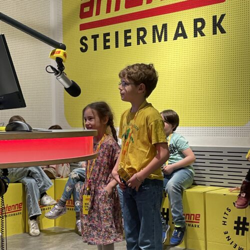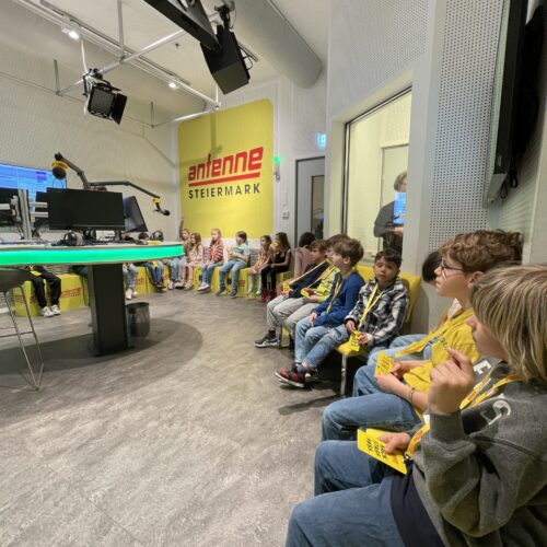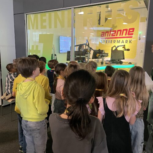 Die Schülerinnen und Schüler der 2.b Klasse konnten letzte Woche das Radiostudio der Antenne Steiermark besichtigen. Dabei bekamen sie einen Einblick von einem großen Radiostudio und konnten die Moderatorinnen und Moderatoren bei ihrer Arbeit beobachten. Das Highlight war, dass alle einmal ins Mikrofon sprechen durften und einige sogar live im Radio zuhören waren.
