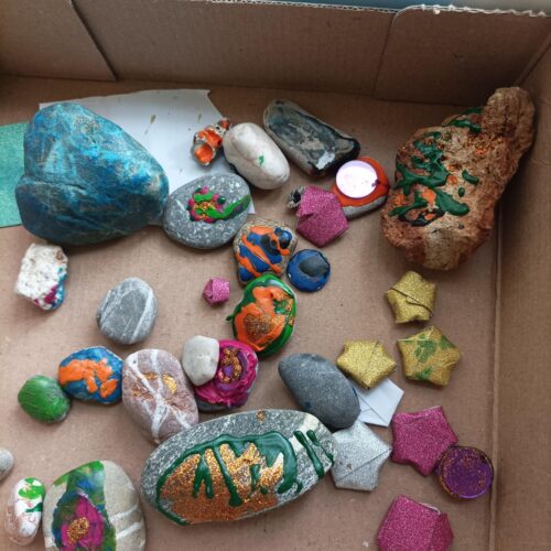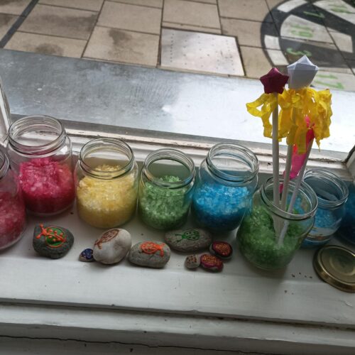 25. September 2024/Nachmi-News/David Pöttler Wir haben Waldschatzkisten gebastelt und im Park befüllt, Badesalz gemacht bzw. eingefärbt (das Projekt ist noch nicht fertig), Zauberstäbe gebastelt und Steine bemalt.