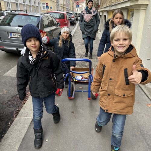Die 2b Klasse nahm im Dezember an der Aktion „Umgekehrter Adventkalender“ der Caritas teil. Jedes Kind der Klasse spendete an einem Tag ein Lebensmittel. Am Ende war eine riesige Bananenschachtel voll mit köstlichen Lebensmitteln zusammengekommen. Voll Freude brachte die Klasse am 21. Dezember diese Schachtel zum Carla-Laden. Die Spenden kommen Bedürftigen Grazer Familien zugute.