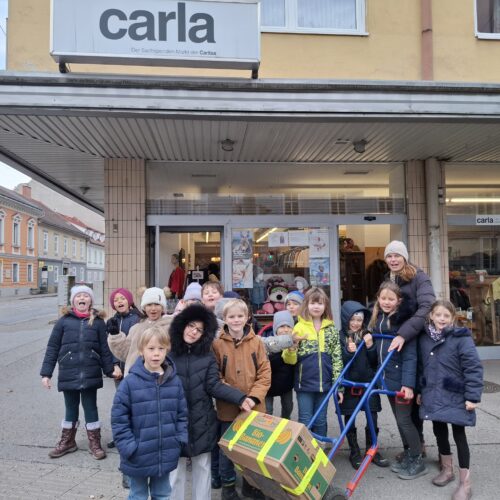 Die 2b Klasse nahm im Dezember an der Aktion „Umgekehrter Adventkalender“ der Caritas teil. Jedes Kind der Klasse spendete an einem Tag ein Lebensmittel. Am Ende war eine riesige Bananenschachtel voll mit köstlichen Lebensmitteln zusammengekommen. Voll Freude brachte die Klasse am 21. Dezember diese Schachtel zum Carla-Laden. Die Spenden kommen Bedürftigen Grazer Familien zugute.